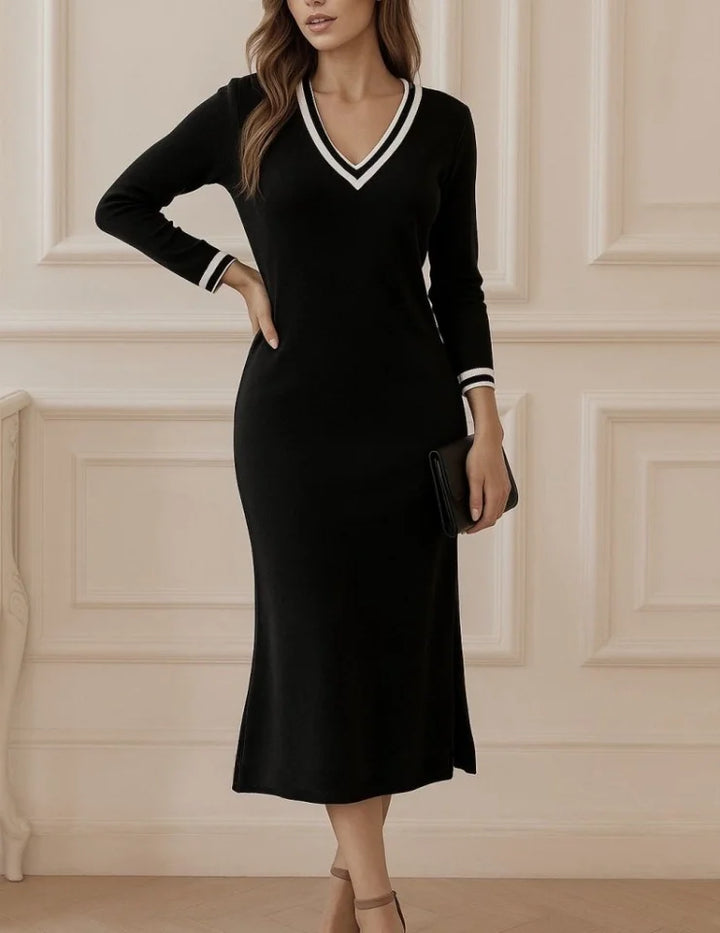 Kadın Uzun Kollu V Ribana Yakalı Yanlardan Yırtmaçlı Midi Viskon Iki Iplik Elbise