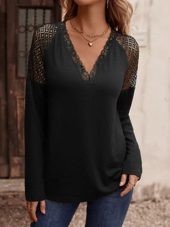 Kadın Uzun Kollu V Yakalı Dantel Detaylı Viskon Bluz