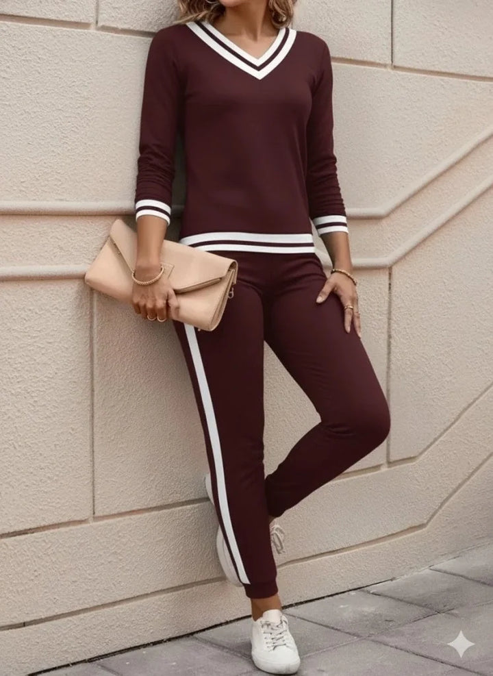 Kadın Uzun Kollu V Yakalı Ribanalı Viskon Iki Iplik Bluz Ve Pantolon Ikili Takım