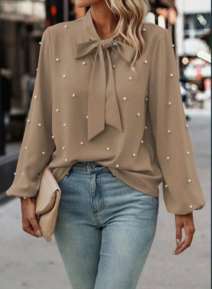 Kadın Uzun Kollu Yakadan Fiyonklu Incili Ithal Krep Bluz