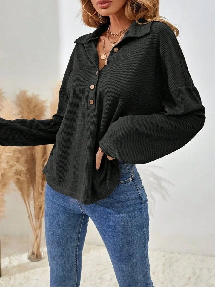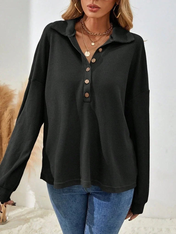 Kadın Uzun Kollu Yakalı Düğmeli Salaş Waffle Bluz