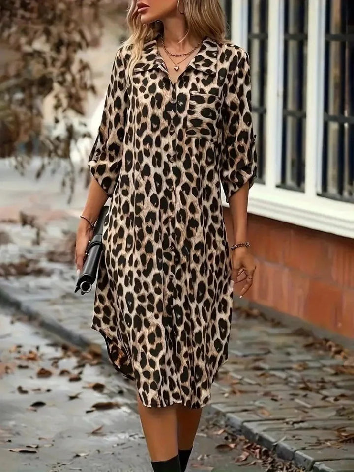 Kadın Uzun Kollu Yakalı önden Düğmeli Leopar Desenli Modal Midi Elbise