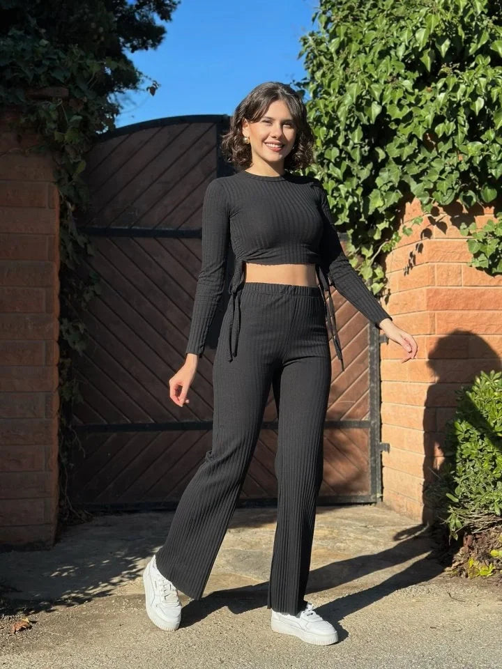 Kadın Yandan Bağlamalı Geniş Paçalı Fitil Kaşkorse İkili Takım