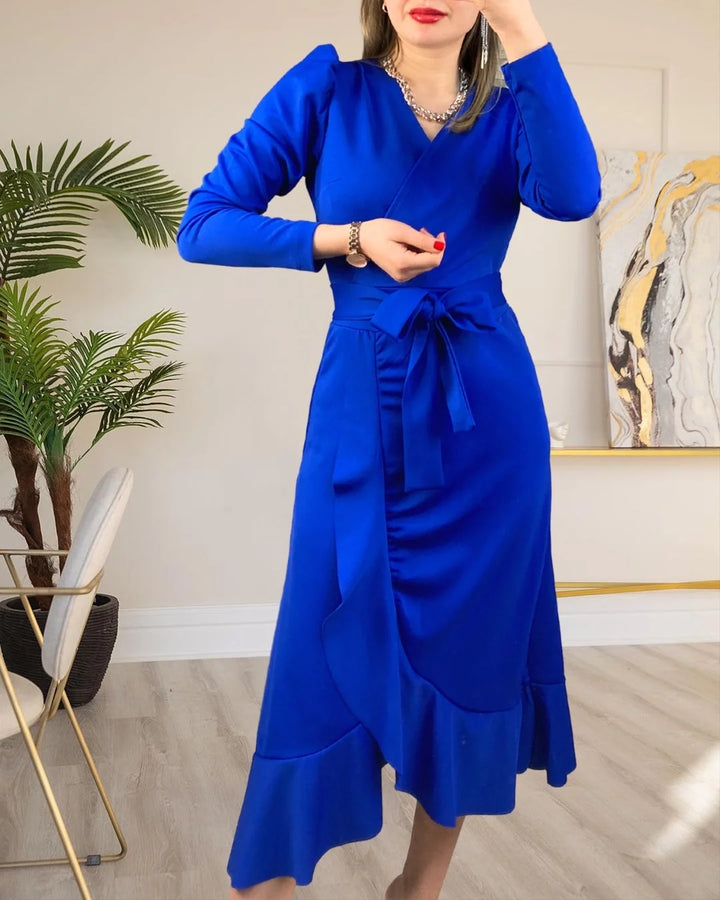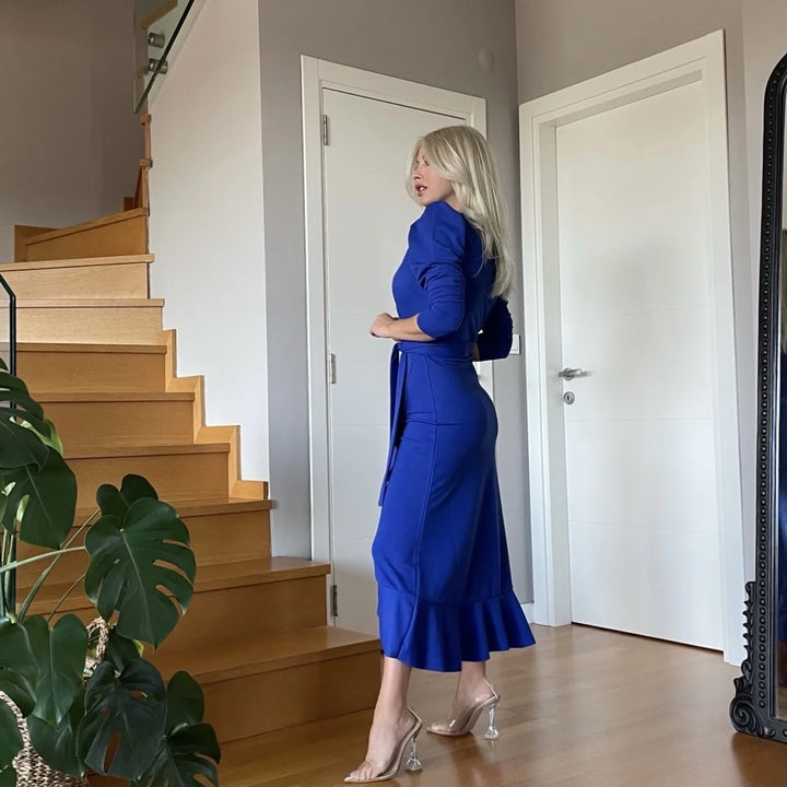 Krep Kumaş Midi Boy Kuşaklı Uzunkol Elbise