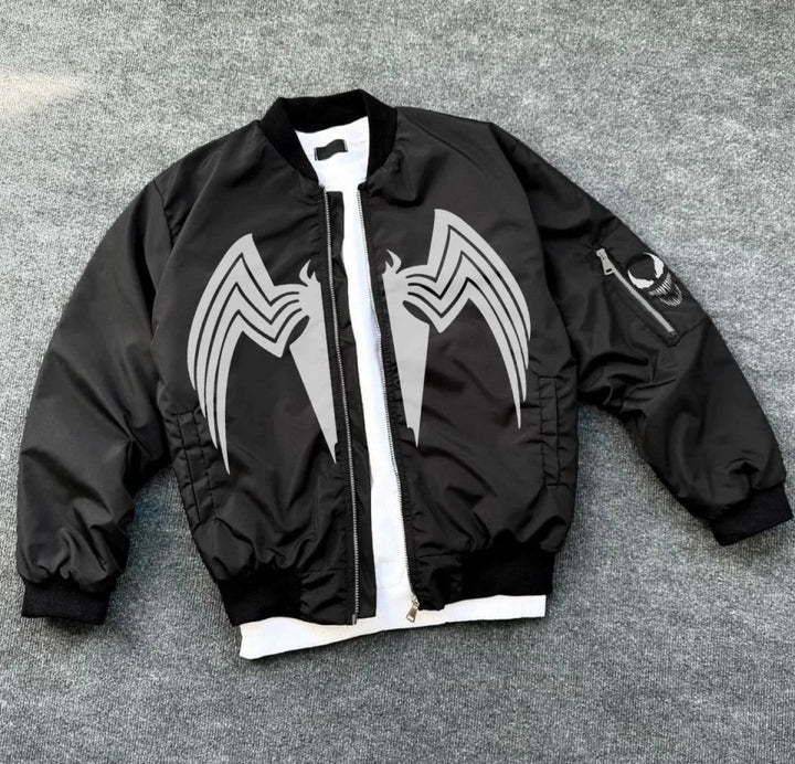 Tam Fermuarlı Uzun Kol Baskılı Bomber Ceket - Siyah