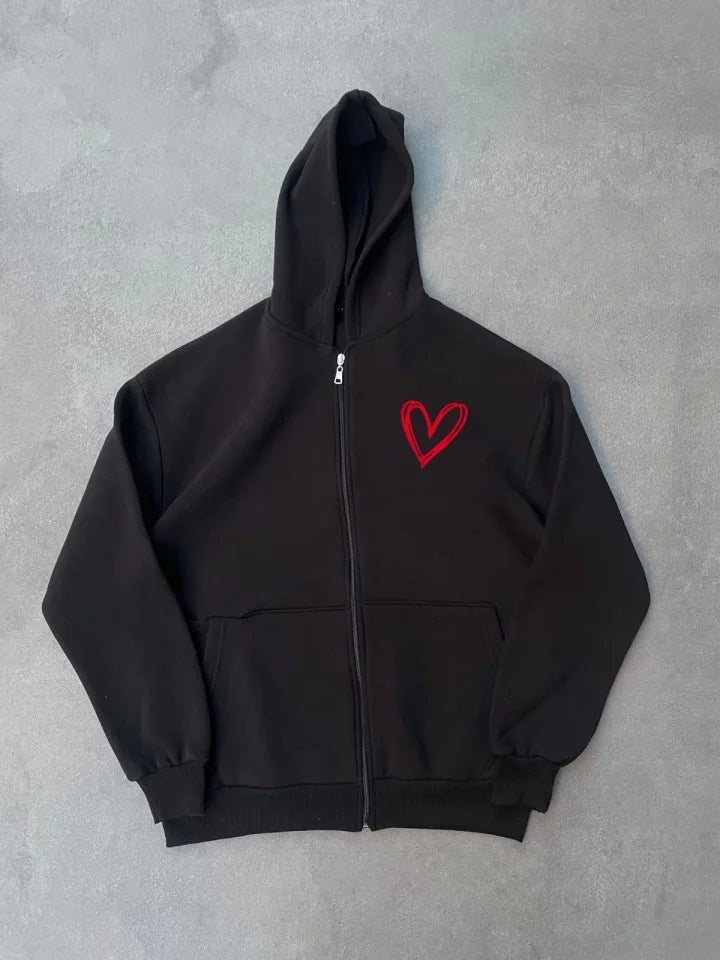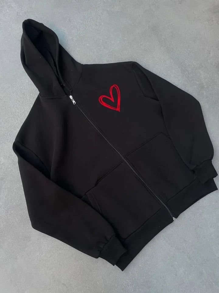 Üç İplik Baskılı Fermuarlı Kapşonlu Hırka - Siyah