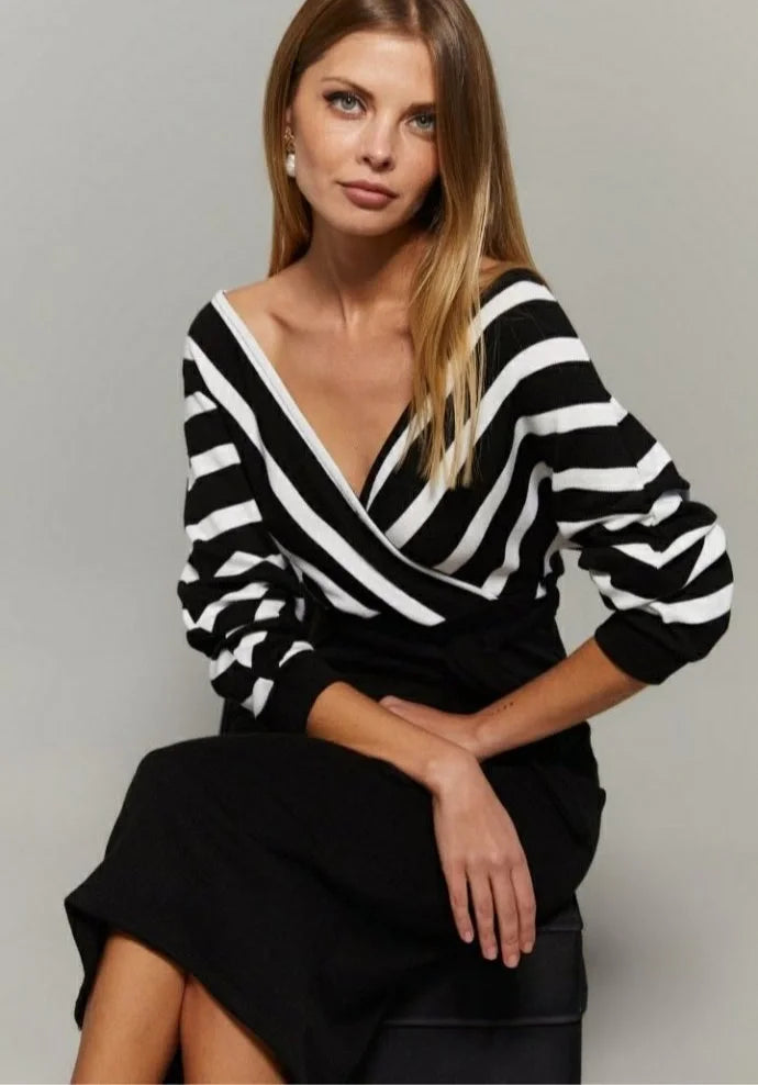 Uzun Kollu Kruvaze Yaka çizgi Desenli Kısa Triko Elbise