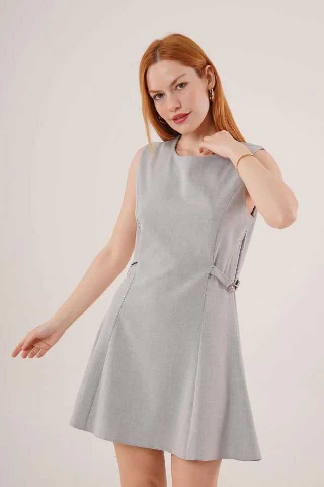 Yanları Zincir Detaylı Sıfır Kol Gri Mini Elbise