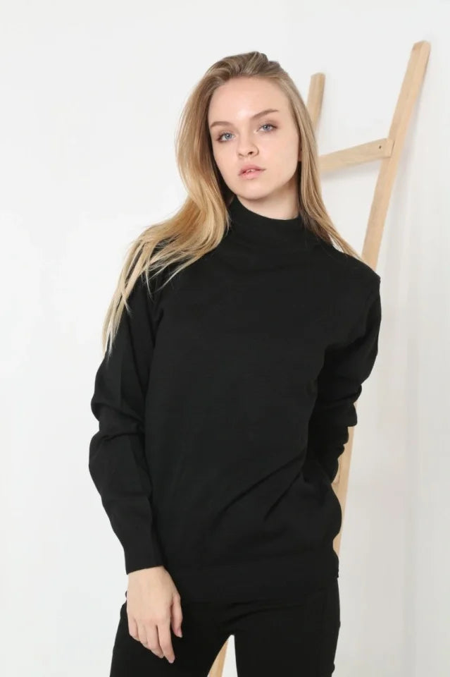 Yarım Boğaz Triko Kazak Yumuşak Dokulu Pamuklu Ince Dokuma, Uzun Kollu Rahat Regular Kalıp - Siyah